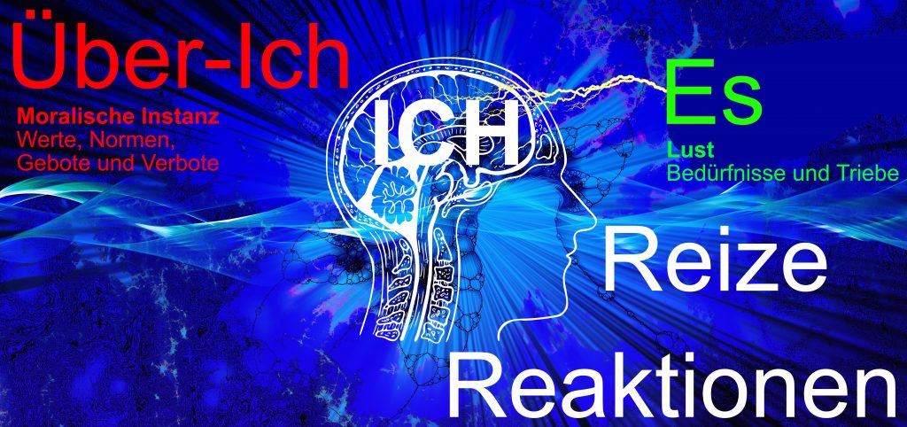 People act consciously and unconsciously. The personality (I) in the conflict between moral rules and norms (superego) and primary instincts (it).